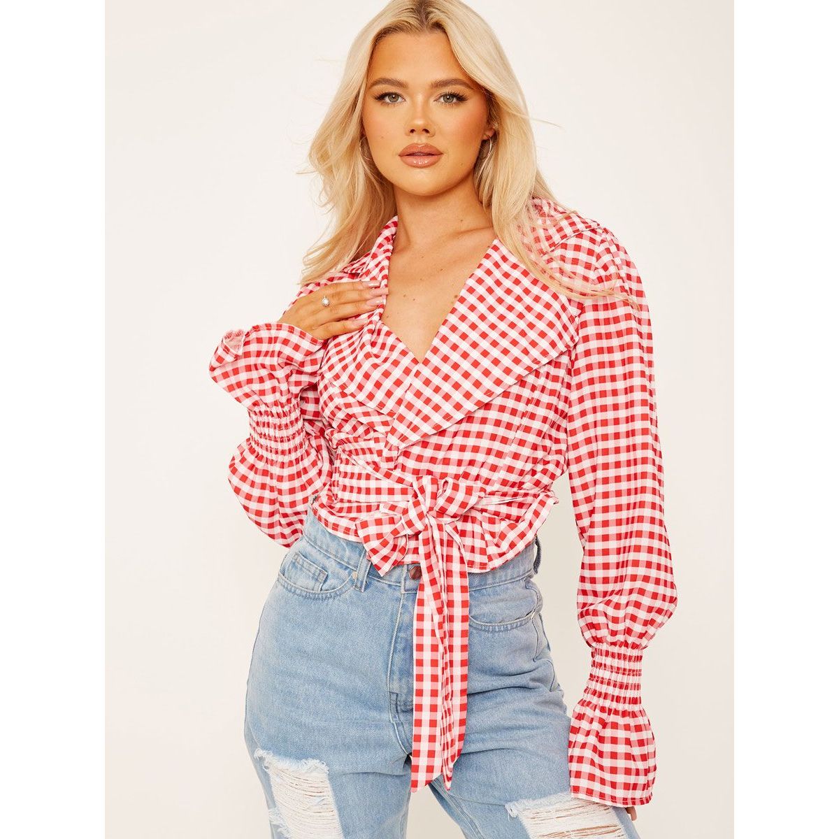 This Checked Wrap Front Tie Knot Top offers a tailored fit with a flattering wrap design that secures with a front tie knot. Its checked pattern provides a timeless, sophisticated look, while the adjustable tie ensures comfort and versatility. Crafted to elevate both casual and polished outfits, this top combines style and function effortlessly.