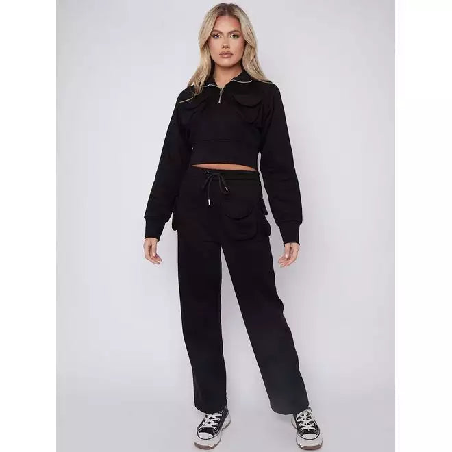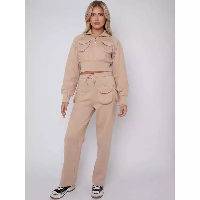 This fleece co-ord set features a utility-inspired crop top with Velcro fastening for easy adjustability, paired with matching trousers designed for comfort and practicality. Crafted from soft fleece, the ensemble provides warmth and a contemporary silhouette, making it ideal for casual wear while maintaining an elevated, structured look. Perfect for transitional seasons, this set balances functionality with modern style through its thoughtful details and cozy fabric.
