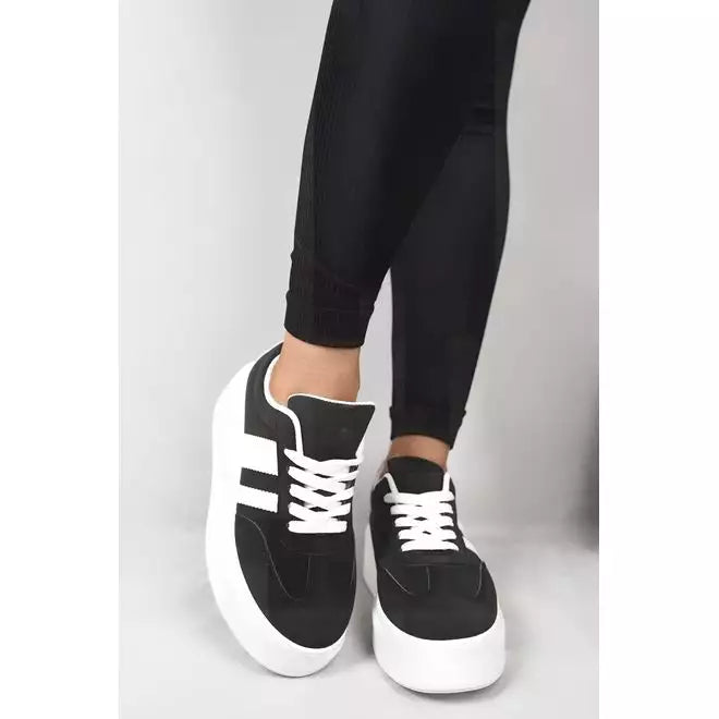 Bold, clean, and seriously comfy. These chunky trainers feature contrast stripe detailing and thick white soles for a sporty vibe. Perfect for casual styling with jeans, joggers, or a ribbed co-ord.